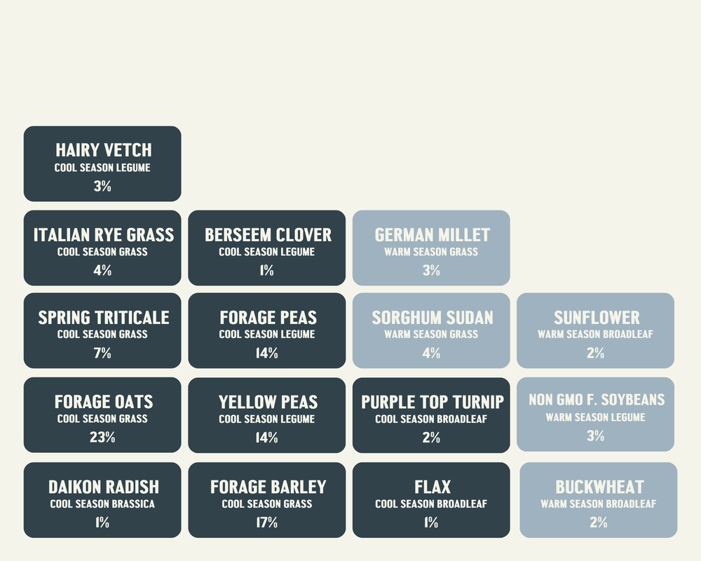 Shallow incorporation with a disc should take place shortly after the legumes in the blend start to flower or the milk stage in cereals. Our apprehension about mowing the crop is much of that vegetative material will oxidize and not be made available to the below-ground biology. Tillage will cycle the nutrients faster and offer biology more surface area around the plant biomass causing rapid breakdown. Try not to over till as the risk of erosion and depleted mycorrhizal fungi increases with every pass, but create a mixture of soil and plant biomass.