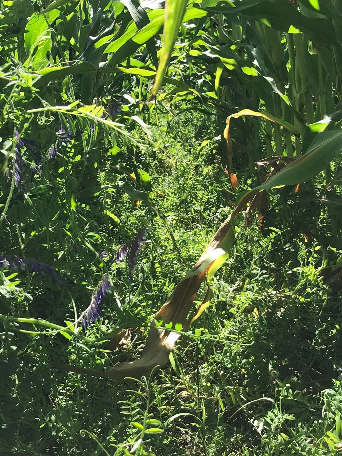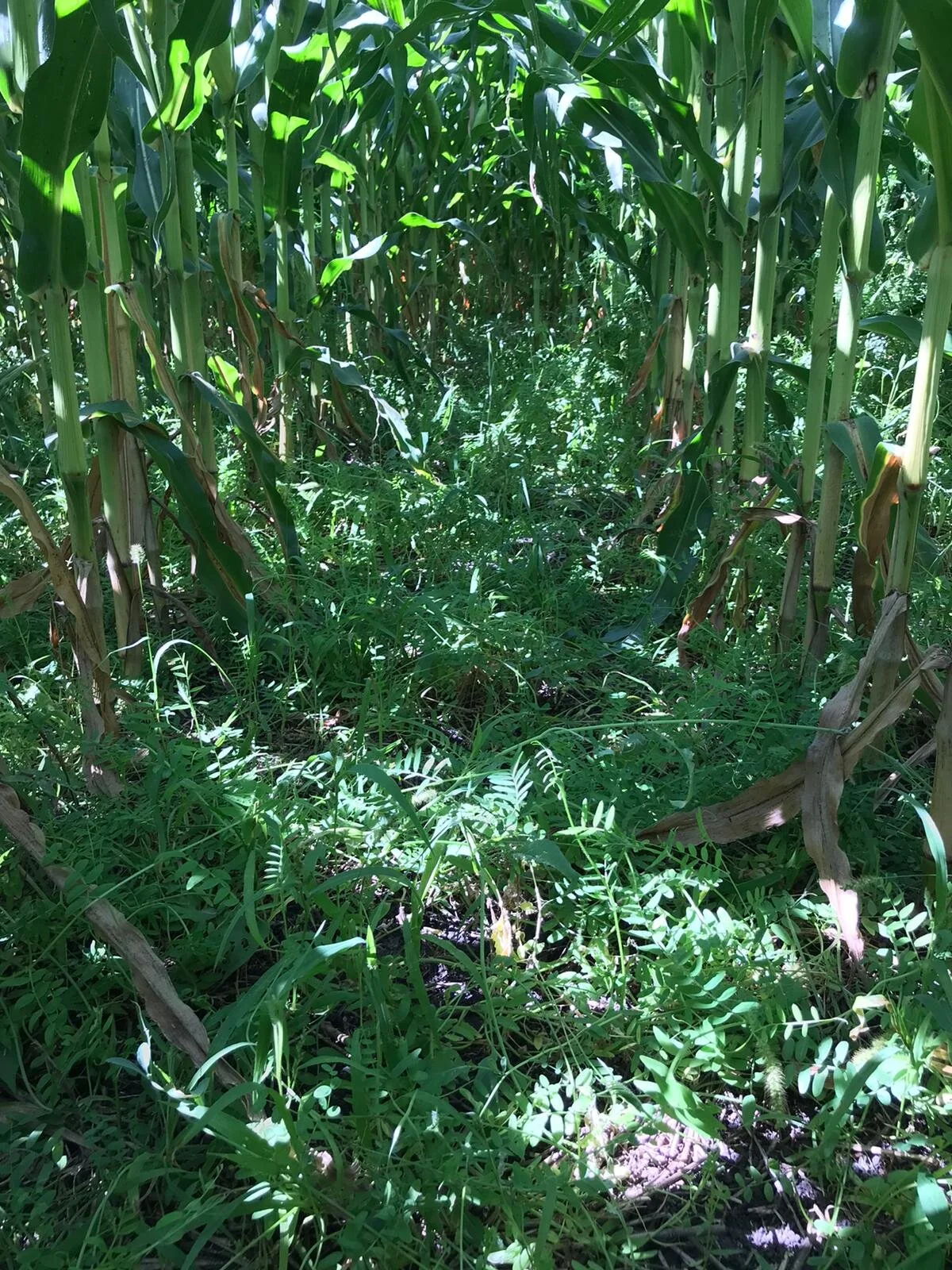 The vegetative vetch (low C:N) balances the high carbon corn (high C:N). This provides an ideal environment for soil microbes to thrive (24:1). This balance also results in a highly palatable cattle feed for the same reason (balanced energy & protein). To learn more about Carbon:Nitrogen and why it is important, click here.