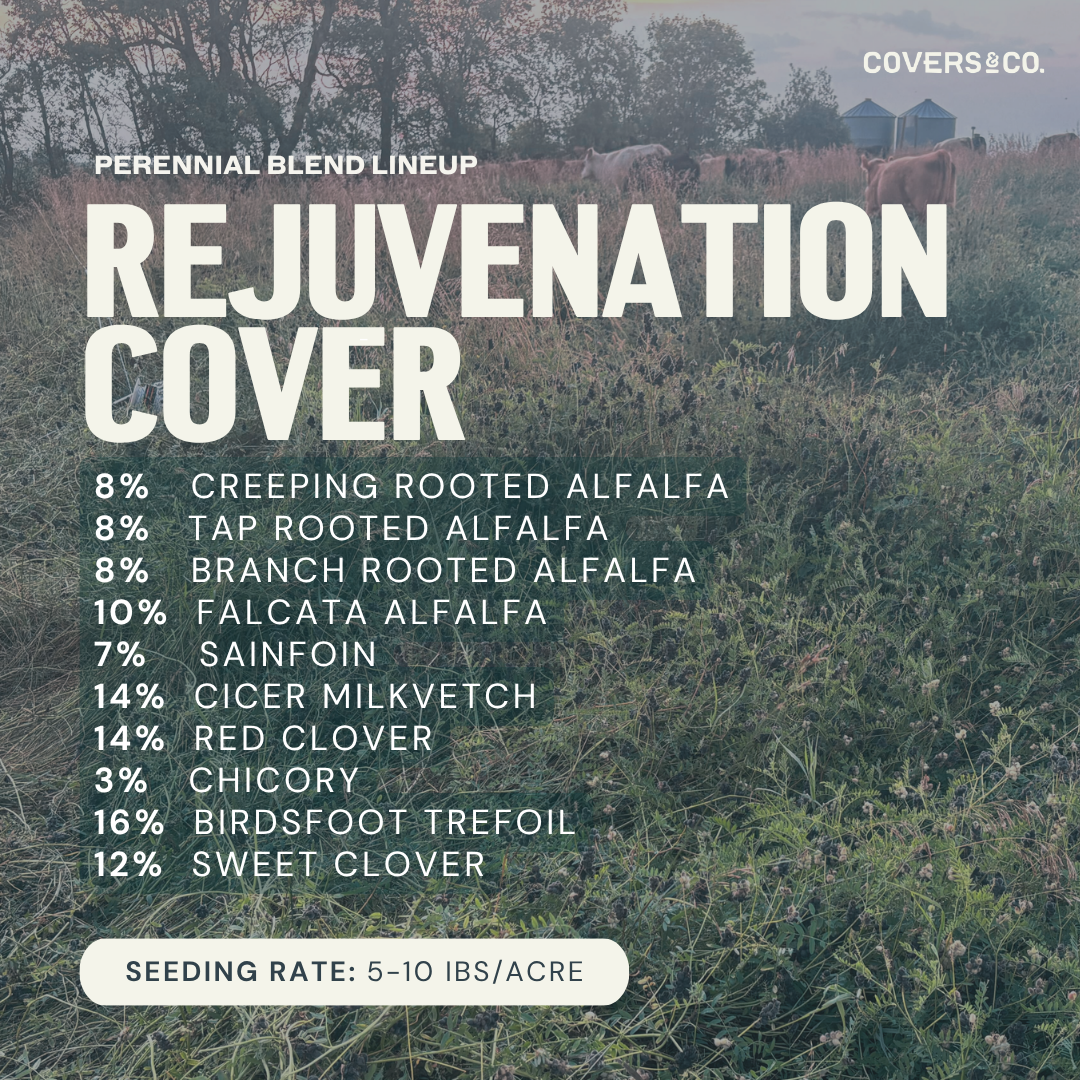 This blend comprises 100% perennial/biennial legumes designed to rejuvenate a perennial pasture stand that lacks diversity and overall production. This blend has been designed to be seeded directly with a drill or utilized in broadcast settings (drones, spin spreaders, etc.)